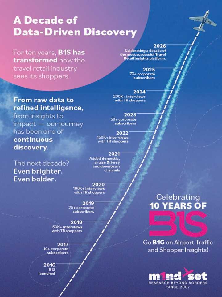 Celebrating a decade of excellence, m1nd-set marks the 10th anniversary of it’s leading product Business 1ntelligence Service (B1S), the Travel Retail & Duty Free industry’s premier marketing intelligence platform. Now a global success story with over 70 subscribers across all categories, the B1S subscription service provides 24/7 access to unparalleled insights. It delivers comprehensive data on air traffic across 1,500 airports worldwide and detailed consumer shopping behavior across airports, ferries, cruise ships, and downtown duty-free locations – all on one platform.
